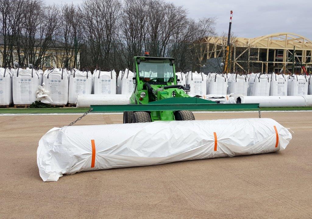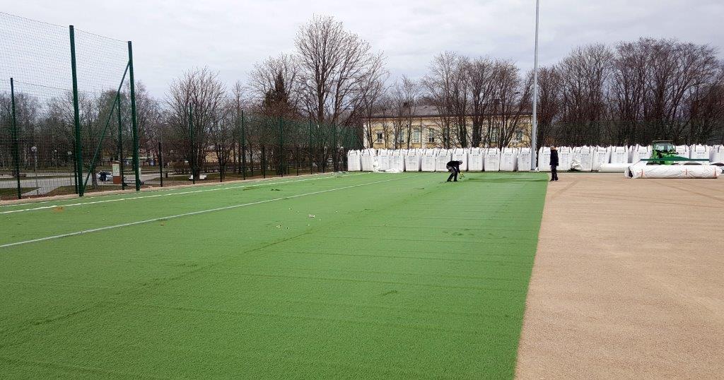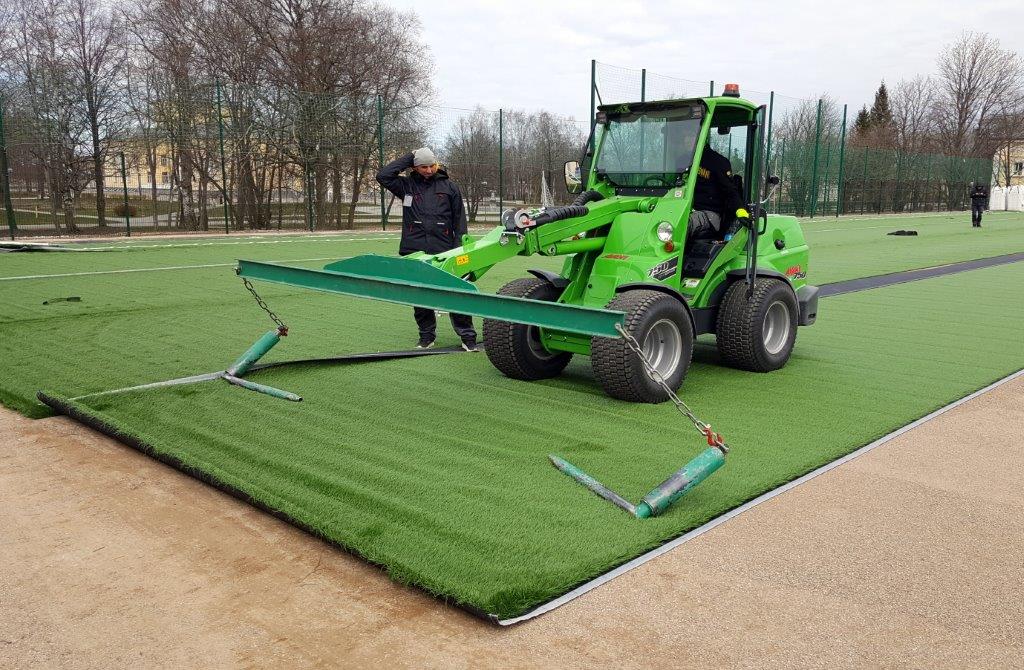 Сегодня на строящемся в Кохтла-Ярве новом футбольном поле, что возле здания бывшей Ярвеской русской гимназии (ул. Ярвекюла теэ, 39 а), начался долгожданный процесс укладки искусственного зеленого газона, привезенного из Нидерландов.