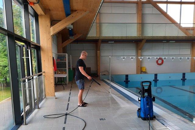 — Действительно, основная работа на прошлой неделе была связана с очисткой наших бассейнов, — говорит руководитель Кохтла-Ярвеского спортцентра Михаил Кастрицкий. – Мы слили старую воду, которая не менялась уже больше года, провели очистку бассейнов и залили новую. Большой бассейн полностью должен заполниться водой сегодня (11.07 — sekundomer). Чистку бассейна производили своими силами, хотя первоначально планировалось пригласить для этой работы специальную фирму. Грязи за год скопилось много, но не так критично, поэтому с этой работой удалось справиться за сутки. Окончательную очистку бассейна проведут наши желтые роботы, поскольку после заливки воды все-равно остатки грязи остаются. Водяные пылесосы мы используем во время каждой очистки бассейна. Ну и сейчас чистим плитку вокруг самого бассейна.